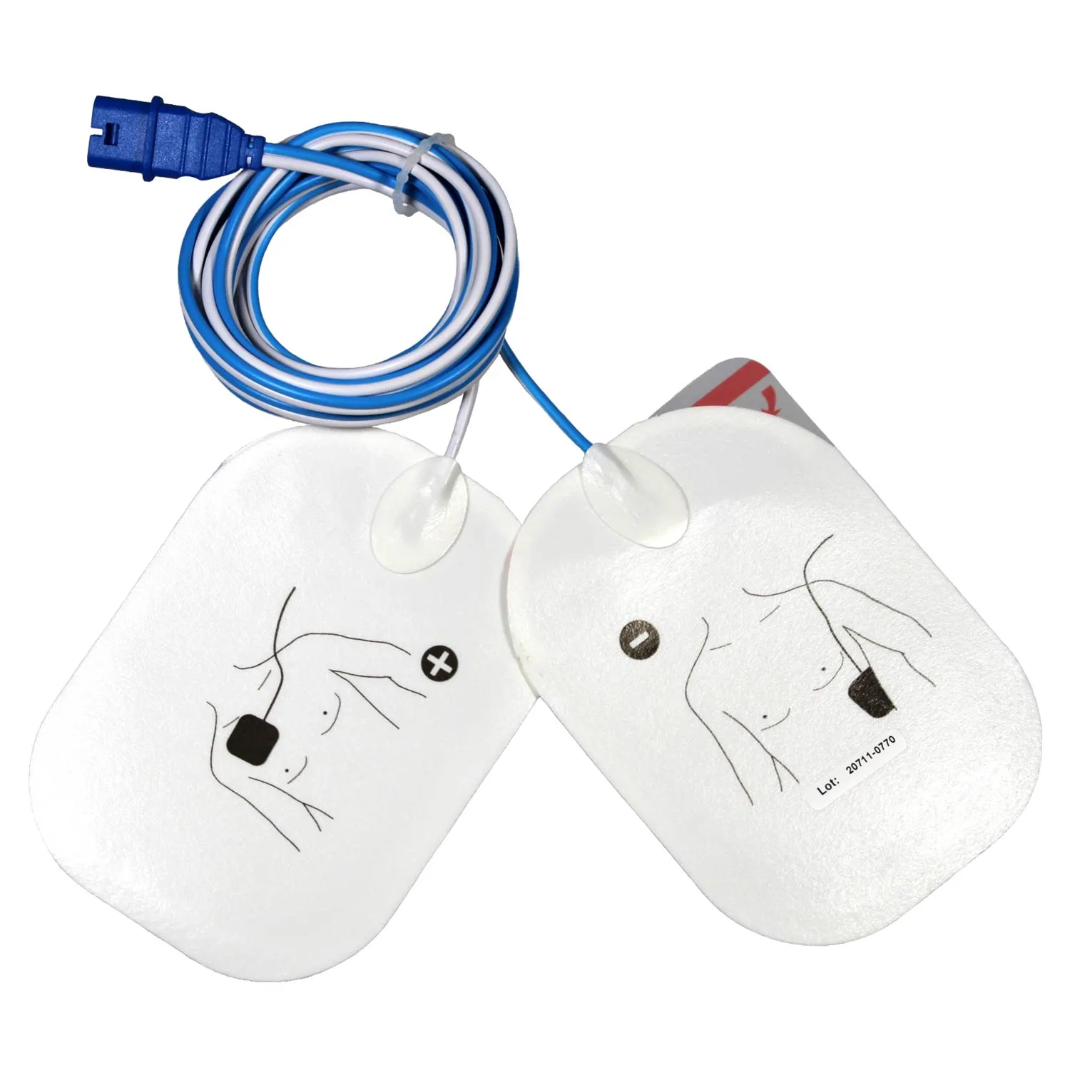 Die Elektroden sind hygienisch verpackt, als Einwegartikel konzipiert und mit klaren Platzierungsanweisungen versehen. Die Steckerfarbe blau erleichtert die Identifizierung und den Anschluss an das Gerät.